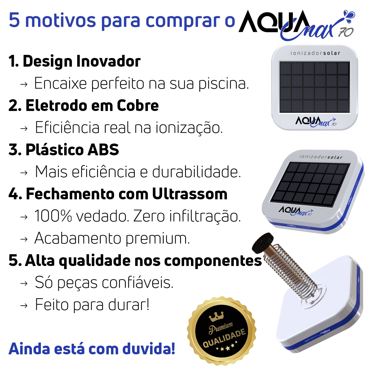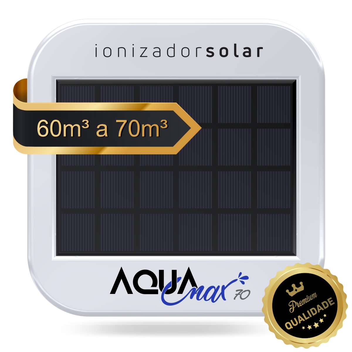 Praticidade, economia e eficiência em um único produto. O AQUA MAX70 é o ionizador solar ideal para piscinas de até 70000 litros, pois oferece uma forma natural e segura de manter a água sempre limpa, saudável e cristalina — sem uso de energia elétrica.